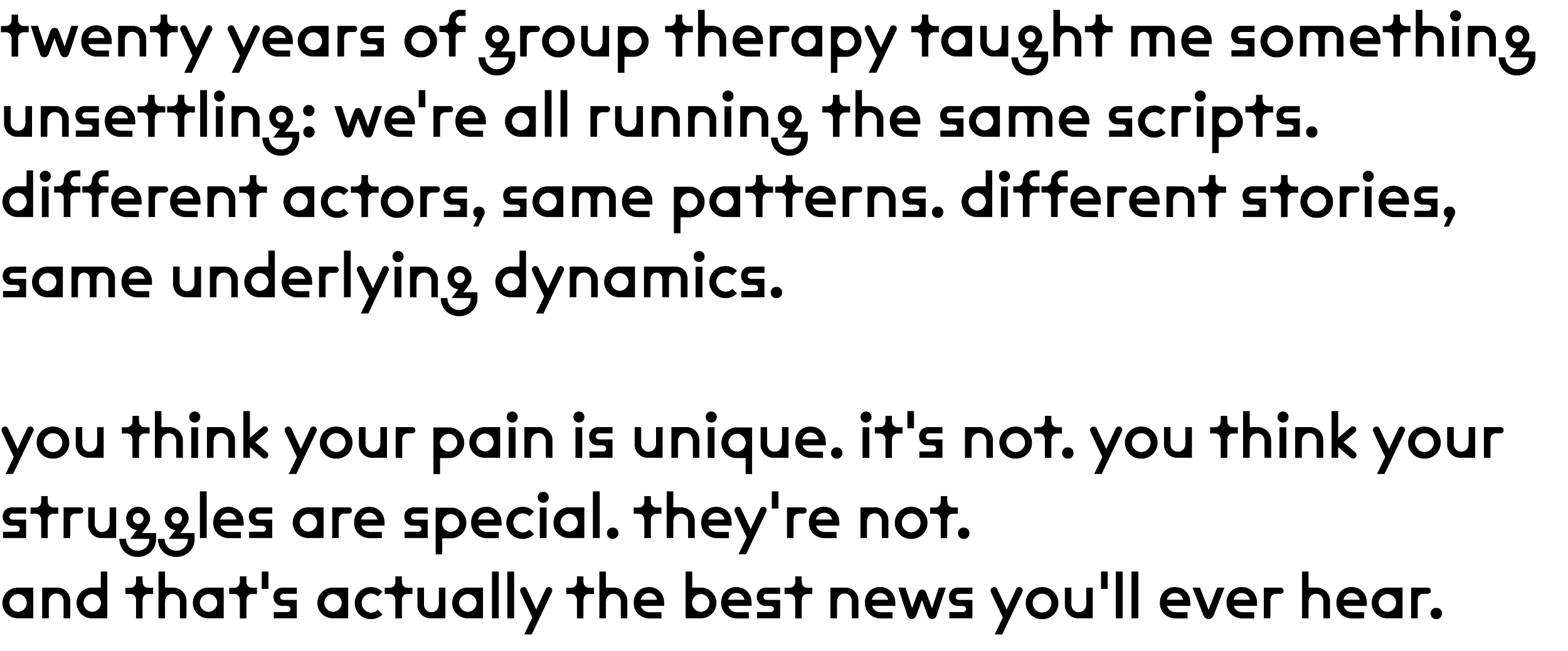 here's where it gets interesting: most of our misalignment follows predictable paths. the compromises you made, the ways you adapted, the masks you wear—i've seen them thousands of times before.