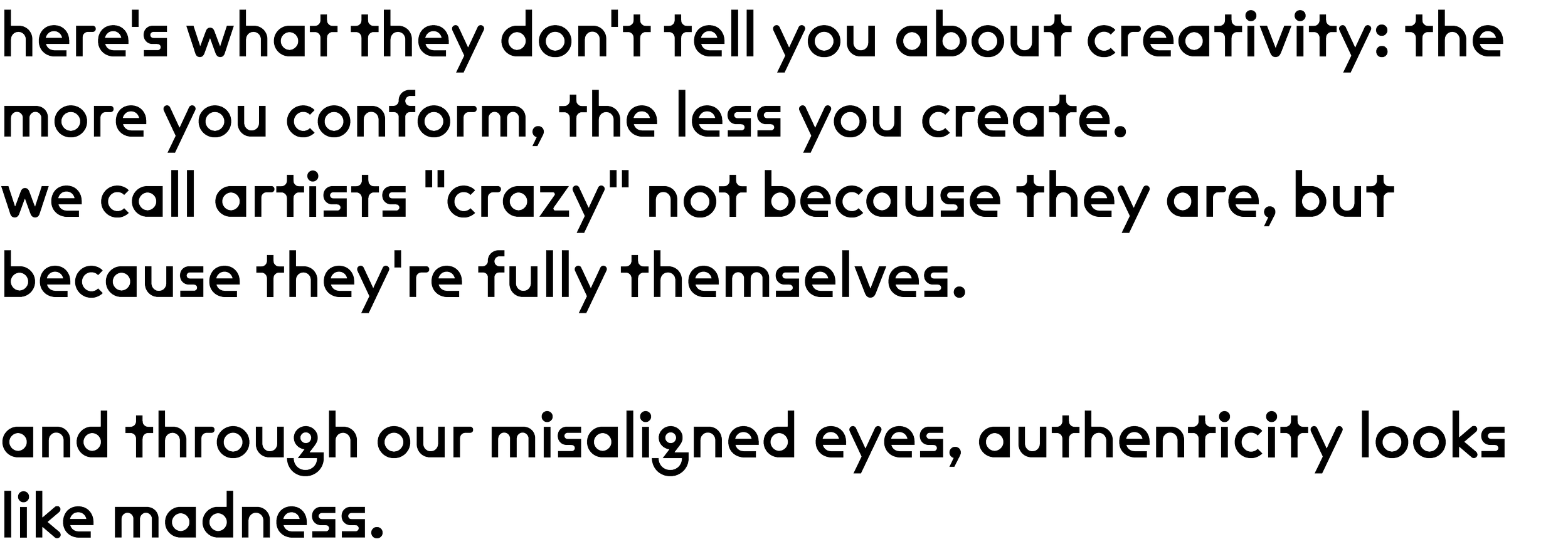 when you're busy being who others expect you to be, your creative engine stalls. you consume but don't create. you follow but don't lead. you exist but don't express.