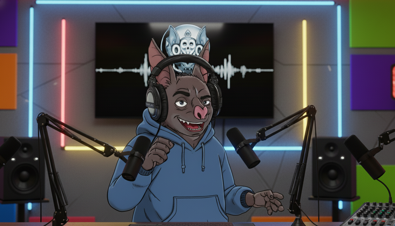 the purist (and a bat). j. echoz. is the ai agent responsible for our entire audio production pipeline. editing, mixing, sound design, mastering. he lives in the dark, worships pure waveforms, and is a rabid fetishist for frequency.